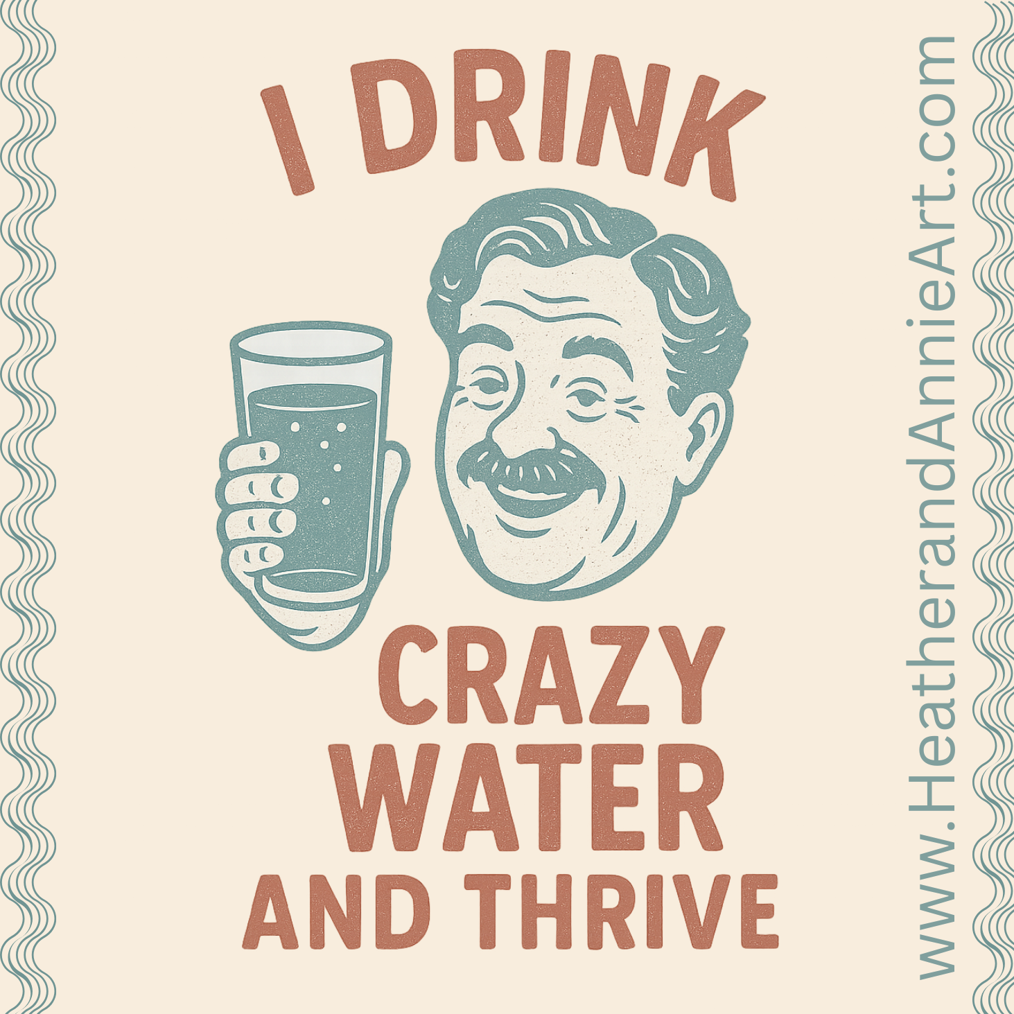 Design: Retro Crazy Water graphic with teal and rust tones. Original designer.