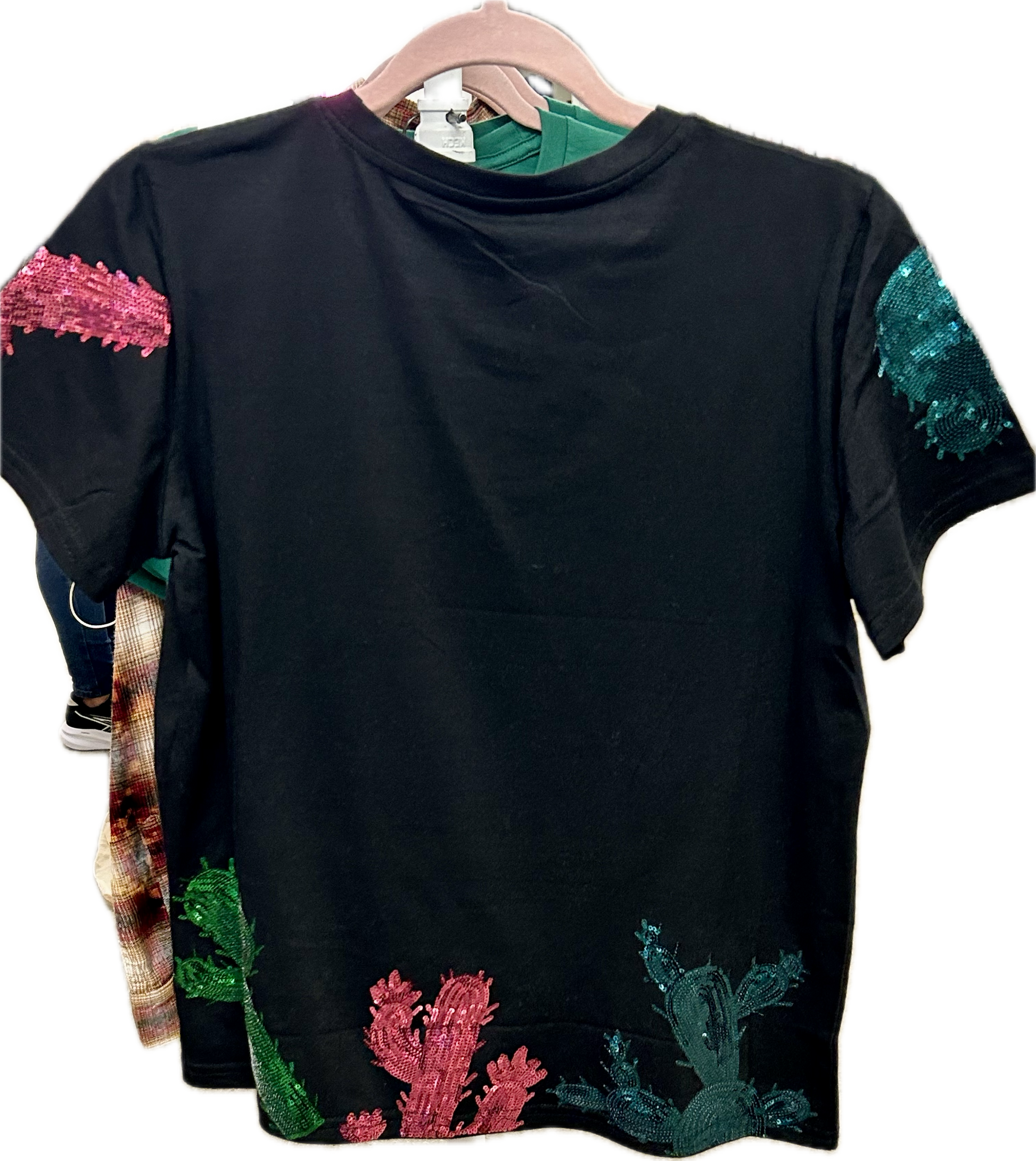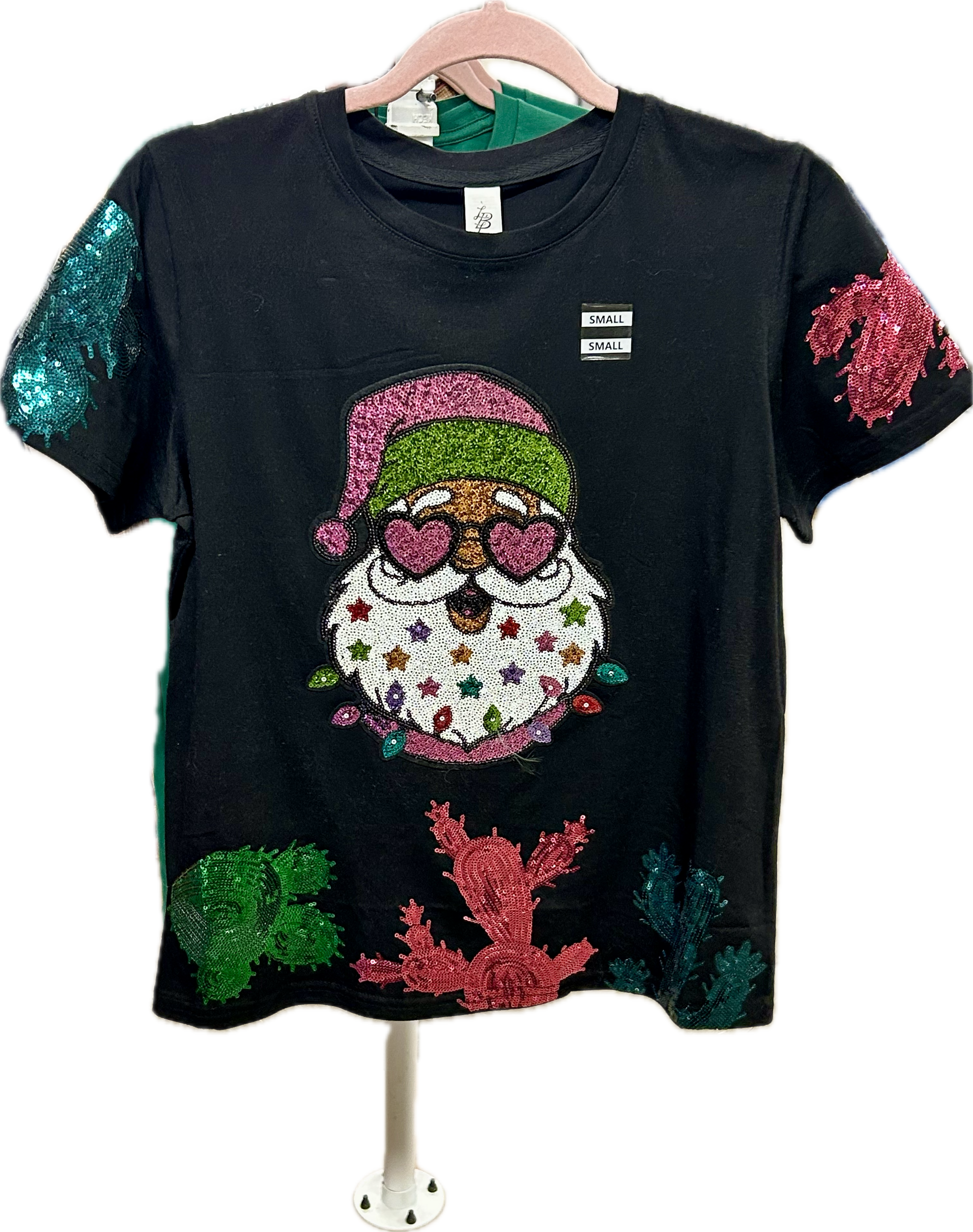 Fiesta Santa Sequin T-Shirt – Black Holiday Tee with Colorful Cactus Sequins
